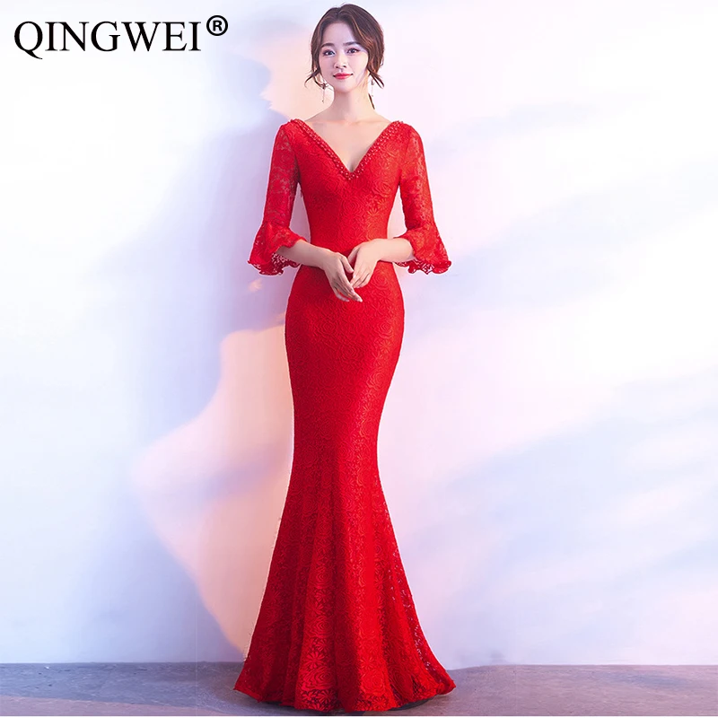 ^Cheap QINGWEI 2019 Elegante V-hals sexy backless strap Vrouwen jurk banket jaarvergadering gehost lange fishtail rood blauw wit jurken
