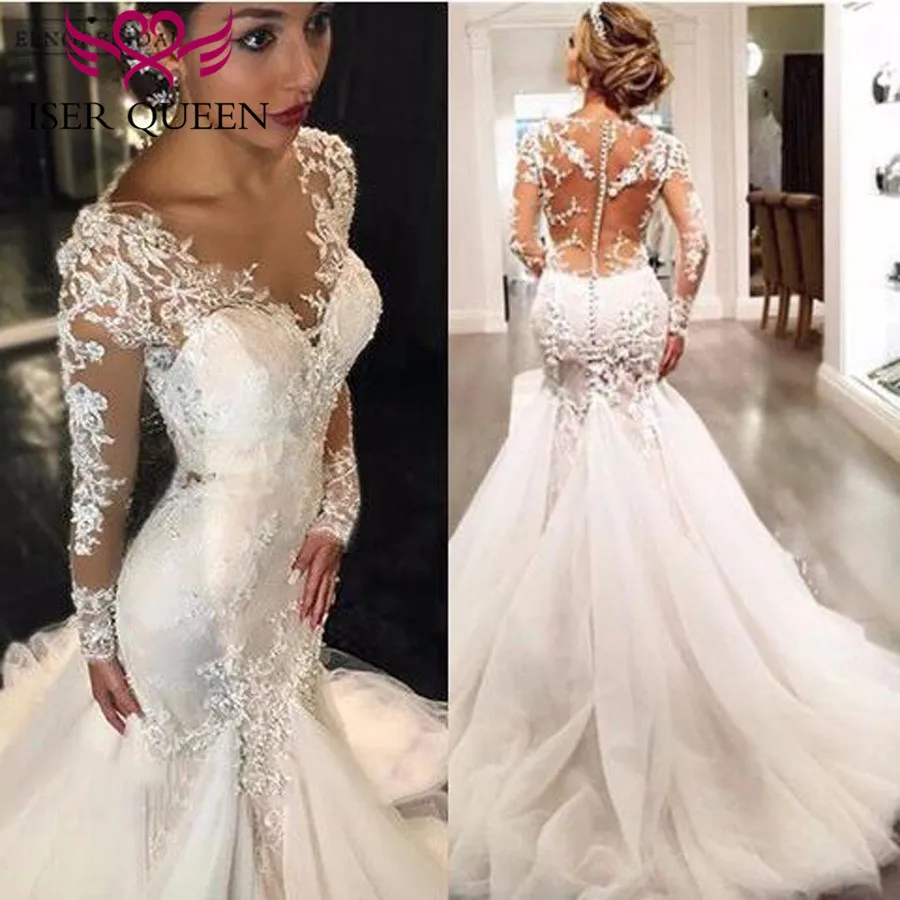 Very Good V-hals Borduren Applicaties Sexy Wedding Gown Lange Mouwen Illusion Kant Kwastje Kant Vintage Mermaid Trouwjurk 2019 W0037 Buy Online