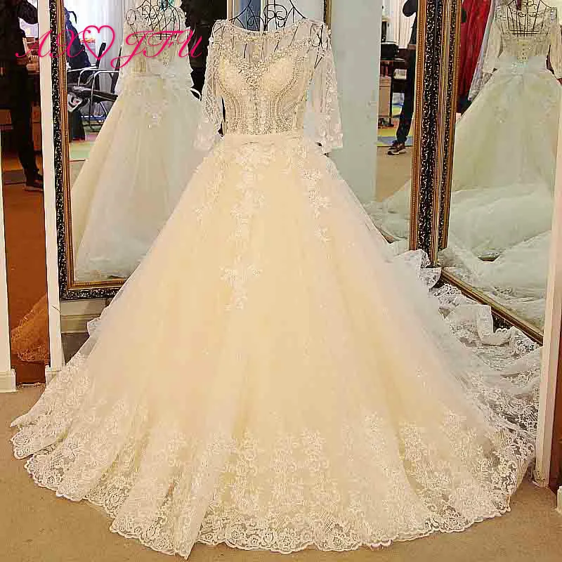 Best Price Axjfu Luxe Prinses Kralen Diamant Witte Bloem Kant Trouwjurk Vintage Handgemaakte O Neck Illusion Boog Trouwjurk 134