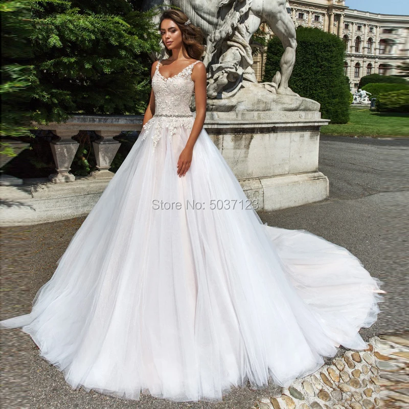 Very Recommended Robe De Mariee Baljurk Trouwjurken Mouwloze Tulle V-hals Kant Applicaties Bridal Gown Hof Trein Vestido De Noiva For sale