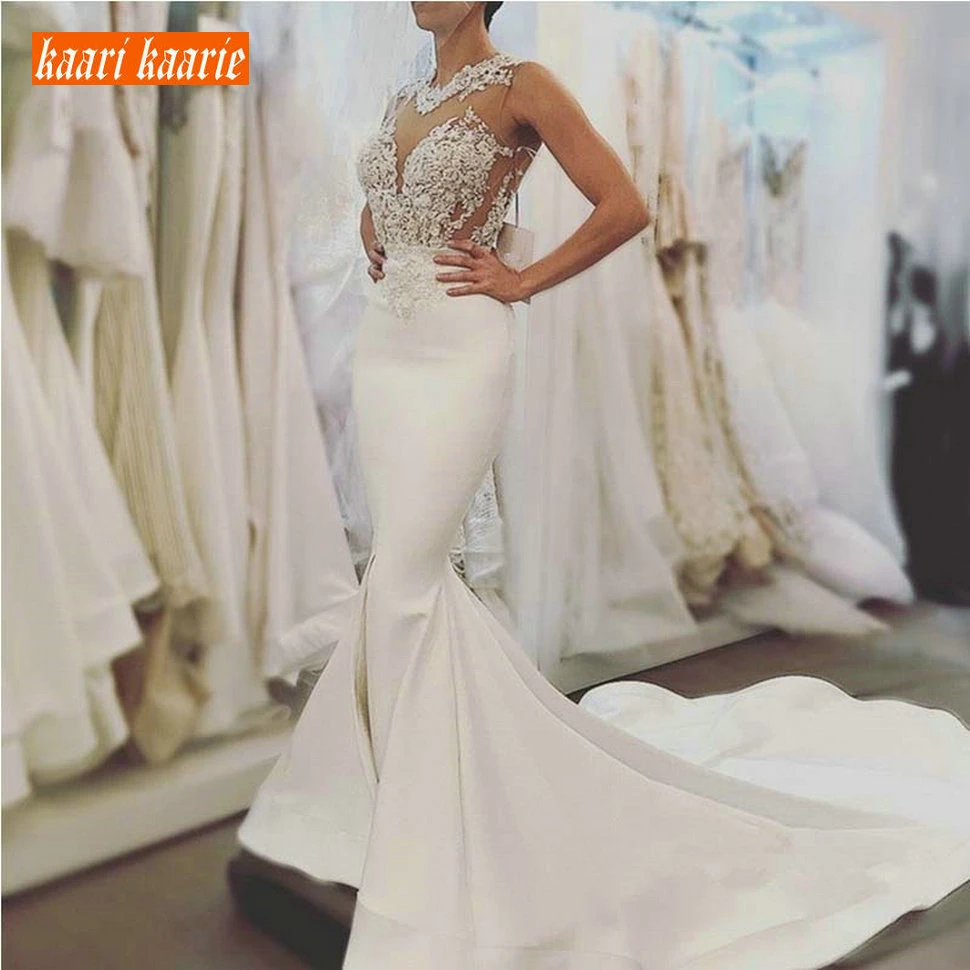 Very Recommended Sexy Witte Mermaid Trouwjurk Lange Satijnen Kant Applique Lijfje Ivoor Bruidsjurken Backless Kapel Trein Kerk Bruidsjurken For sale