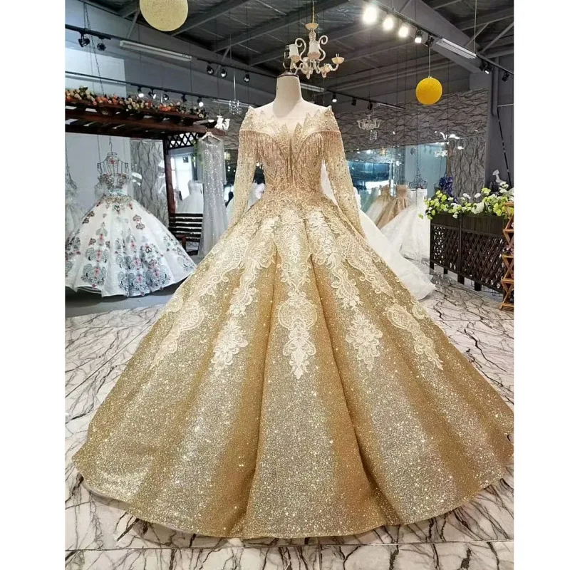 Best Price Bgw 21826ht Glanzende Gouden Curve Vorm Avondjurk Speciale O-hals Lange Tulle Mouwen Floor Lengte Baljurk Avond Party Dress