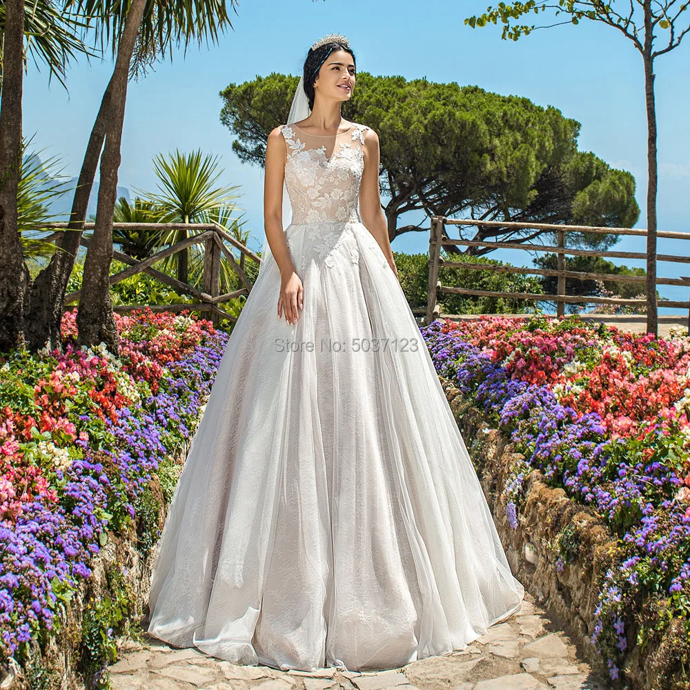 Wonderfull EEN Line Trouwjurken Mouwloze Scoop Kant Applicaties Button Illusion Vestido De Noiva Hof Trein Bruidsjurk Maat Best Reviews Of