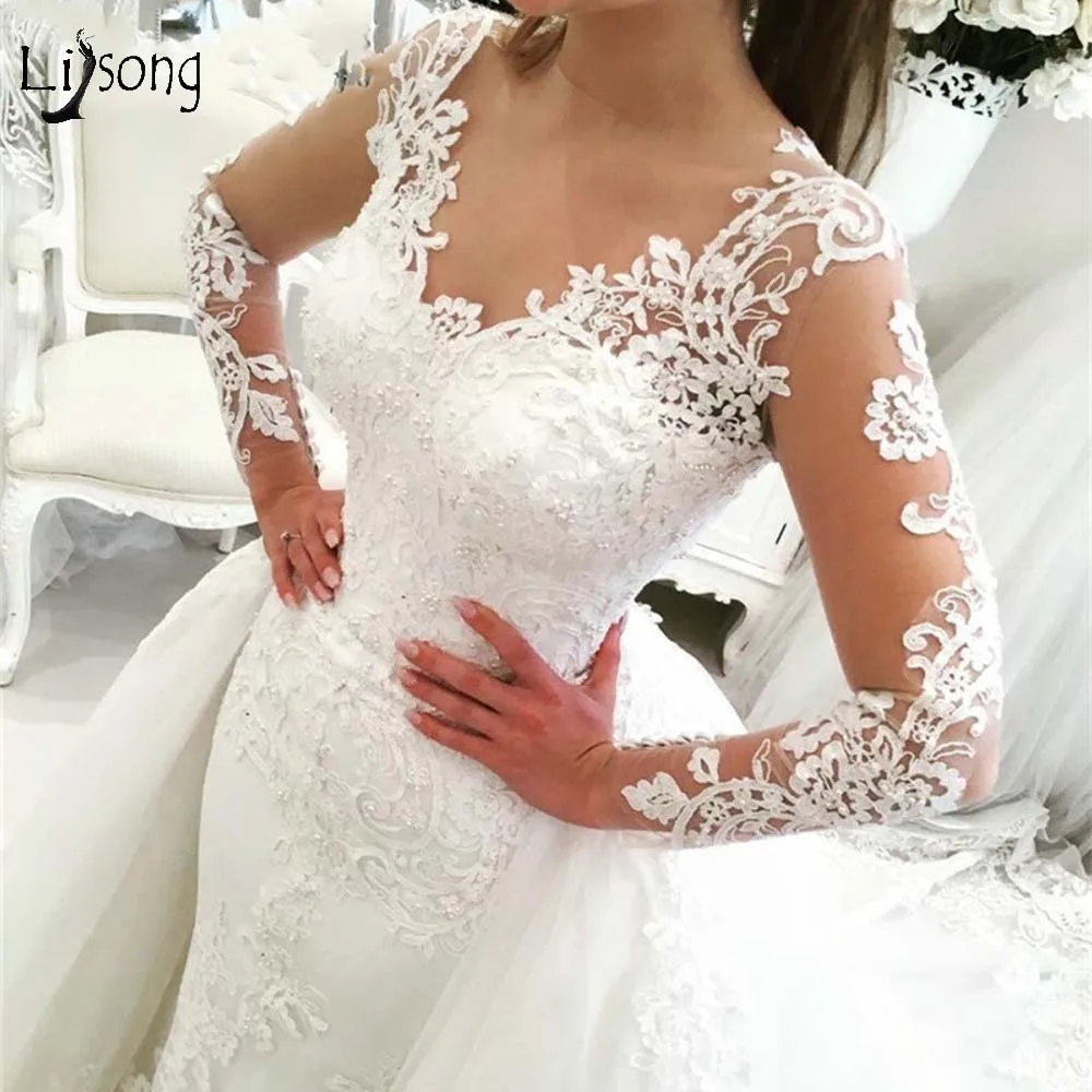 Wonderfull Elegant Dubai 2 Pieces Mermaid Trouwjurken Met Afneembare Trein 2019 See Thru Volledige Mouwen Kant Bruidsjurken Button Price Comparisons For