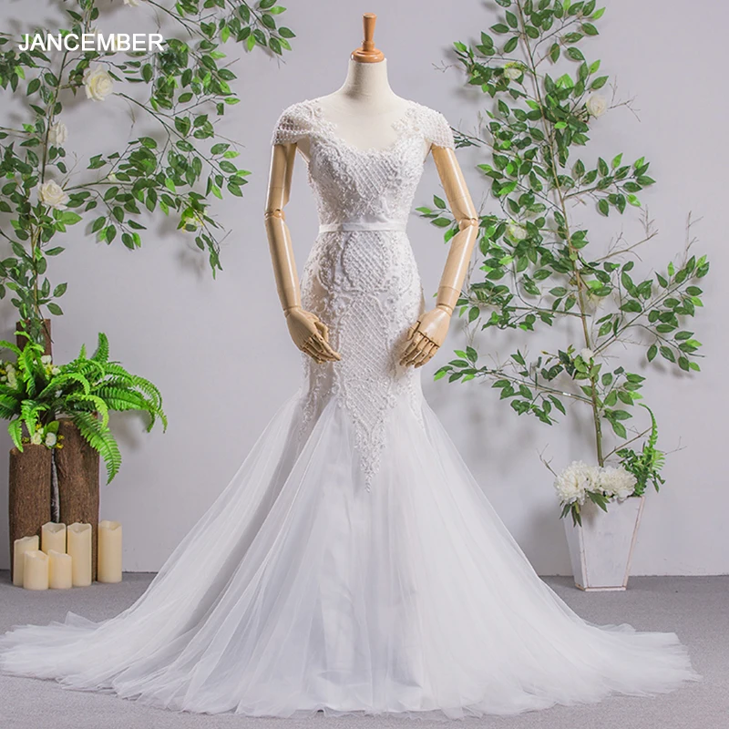Wonderfull J66325 Jancember Mermaid Trouwjurken 2020 V-hals Floor Lengte Parels Linten Witte Bruid Jurk Met Trein Vestido De Novia Who Sells The Cheapest Online