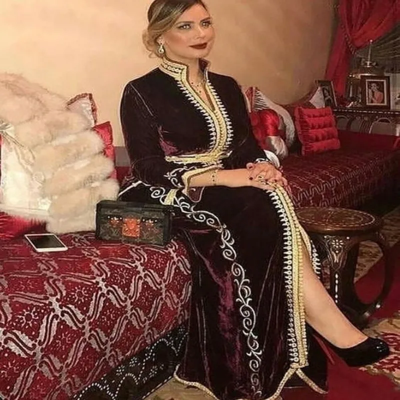 ^*Best Offers Karakou Algérien lange mouwen prom formele jurken 2020 bourgondië velvet gold lace applique caftan kaftan arabisch slit avondjurken