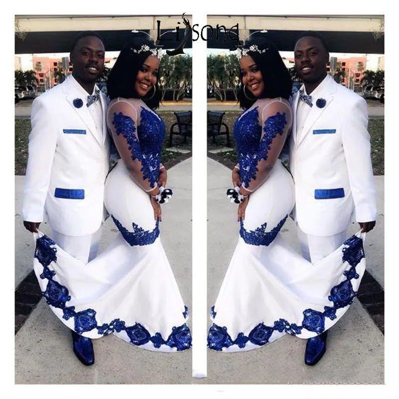 ^*Best Offers Nieuwe White Satin Royal Blue Lace Aso Ebi Afrikaanse Prom Jurken Lange Illusion Mouwen Geappliceerd Mermaid Avond Formele Gowns Pageant celebrity Jurk Abendkleider