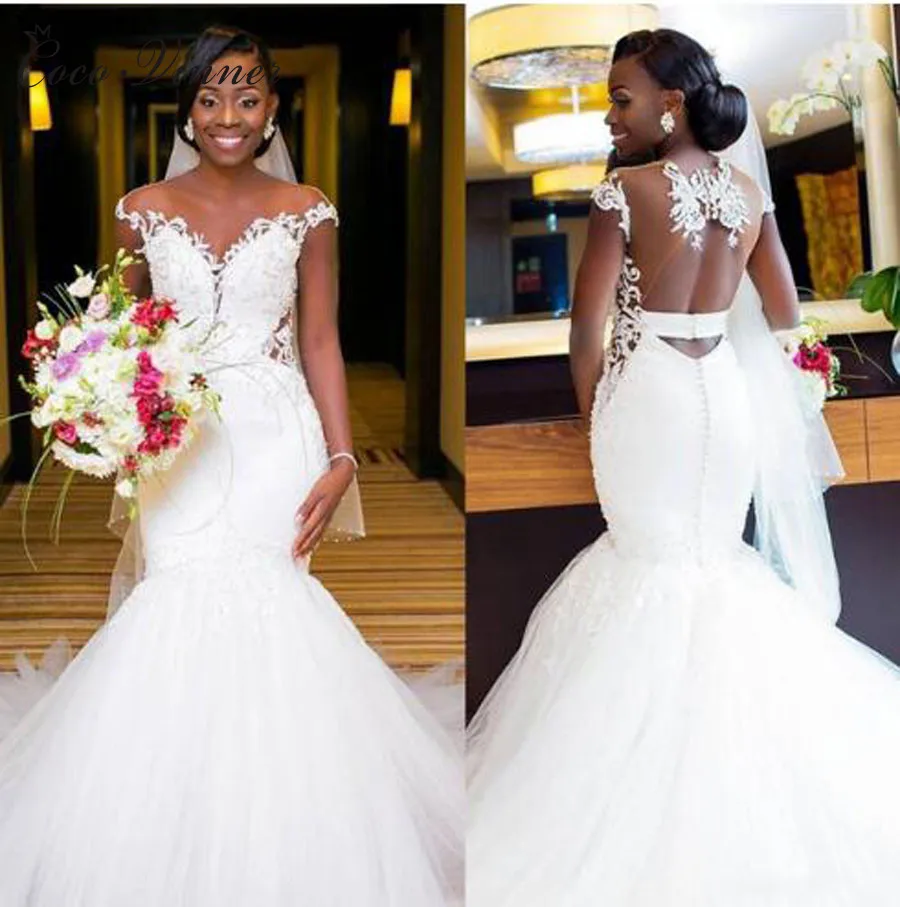 Best Price Sexy Illusion Terug Afrika Mermaid Trouwjurken 2019 Pure White Cap Sleeve Borduren Kralen Kant Bruid Trouwjurk W0360